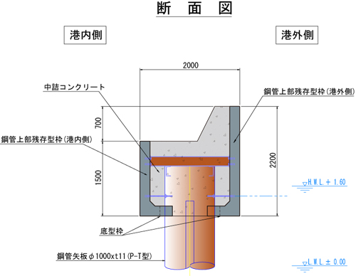 | 採用理由: | 当初、防波堤上部工は現場打ち鉄筋コンクリートで構築する予定でしたが、下記理由より鋼管上部残存型枠「ハーバーキャップ」が採用されました。 1.型枠工が不足している 2.生コン供給が不足している 3.ハーバーキャップは型枠足場が不要である 4.ハーバーキャップは現場打ちに比べて施工日数が半減できる |